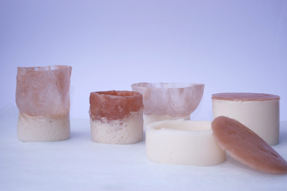 Paula: Oba materiály jsem vytvořila sama. Když chcete, aby byly materiály hotové pro trh, ve většině případů je potřeba spolupracovat s odborníky na materiál/výrobu/strojírenství, což ale může být obtížné. Zároveň, posunutí vašich materiálů na vyšší úroveň si vyžaduje čas, trpělivost a získávání známostí. Obávám se, že nemohu prozradit informace o vývoji mých materiálů, ale zato mohu doporučit, abyste zahájili spolupráce velmi brzy. To je důležité hlavně pro zjištění, které trhy umožňují uplatnění materiálů v super rané fázi, a které zase naopak vyžadují opravdu pokročilý vývoj materiálu. Jako příklad mohu uvést takzvané designové objekty, které považujeme za materiály v rané fázi. Pokud ale chcete uvést na trh produkt, třeba obaly na potraviny, tak v tomhle případě si vývoj vyžaduje specialisty, jako jsou inženýři a odborníci na obaly. V tomhle konkrétním případě byste ale také potřebovala investice. Celkově bych teda doporučovala zvolení spoluprací obdobným způsobem. Když vezmu v potaz univerzity, tam je často snadné najít někoho z přírodovědného nebo inženýrského oboru, kdo by mohl mít zájem o spolupráci a případné spoluzaložení projektu. Podívejte se například na projekt NotPLA, který pochází z prostředí univerzity, anebo Loliware, také založili bývalí studenti, kteří začínali ve své vlastní kuchyni a nyní mají velké výrobní možnosti. Chcete jít cestou průmyslového designu, designových objektů, umění, nebo startupu? Další možností je pokračovat ve výzkumu na univerzitě formou doktorátu, při němž můžete znovu využít fantastickou síť a možnosti univerzit pro vybudování týmu a následné založení společnosti. Jako například Orange Fiber z Milána.